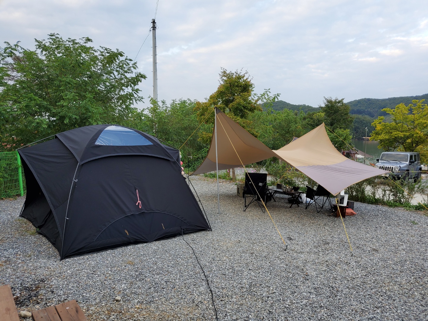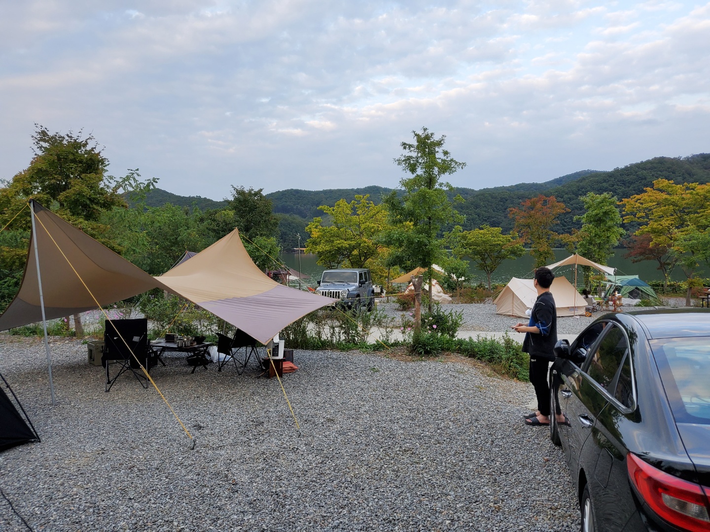 2020년 10월 초 두 번째 캠핑. 경기도 가평에 위치한 생긴 지 얼마 안 된 신생 캠핑장이다. 유튜브 보다가 알게 된 캠핑장인데 집에서도 엄청 가깝고 바로 앞에 청평호가 있어서 어느 자리 나 뷰가 좋을 듯해서 다녀오게 됐다. 특히 빠지 하는 분들에게는 정말 좋을 캠핑장이다. 정면 중간에 빠지할 수 있게 시설이 되있고 캠핑장은 3개의 단차로 파쇄석으로 이루어져있다. 물론 오른쪽 편에는 팻존도 있고 잔디로 구성된 그린존도 있는데 파쇄석을 추천한다. 3층A15번 자리에서 일박을 묶게 되었는데 3.3미터 텐트와 타프를 설치하고 차를 주차했는데도 한동의 텐트를 더 설치 할 수 있을정도로 넓은 자리라 넓찍한 공간이 너무 좋았다. 옆사이트와의 간격도 그만큼 넓어서 대화소리도 잘 안들리고 정말 특이했던 점은 엄청 조용해서 유독 메너 좋으신 분들이 오신 건가 생각했는데, 그게아니라 탁트인 공간 덕에 더욱더 조용한 느낌이아니었나 싶다. 사이트마다 개수대가 설치 되어 있어서 설거지도 편히 할수 있다. 동계에는 사용불가인데 그 외 계절에 가시는 분들은 편하게 이용하실 수 있다. 단점은 화장실이 조금 지저분하다는 점 샤워하기 좀 그랬다. 날씨 좀 더워지면 샤워는 필수인데, 그래도 묵으면서 사이트 구경해본 결과 맨 앞줄 일층이나 맨 끝줄 3층이 좋은 것 같다. 특히 맨 왼쪾 사이트 추천. 아는 동생이 내 추천으로 일층 맨 오른쪽 사이트를 다녀왔는데도 큰 불편함 없이 너무 좋았다고 한다. 그런데 이곳도 이미 아는 사람들이 많아져서 가기가 힘들 수도 있겠다. 이번 시즌은 다른 캠핑장을 다니느라 놓쳤지만 2021년에는 장박을 이곳에서 해볼 예정이다.