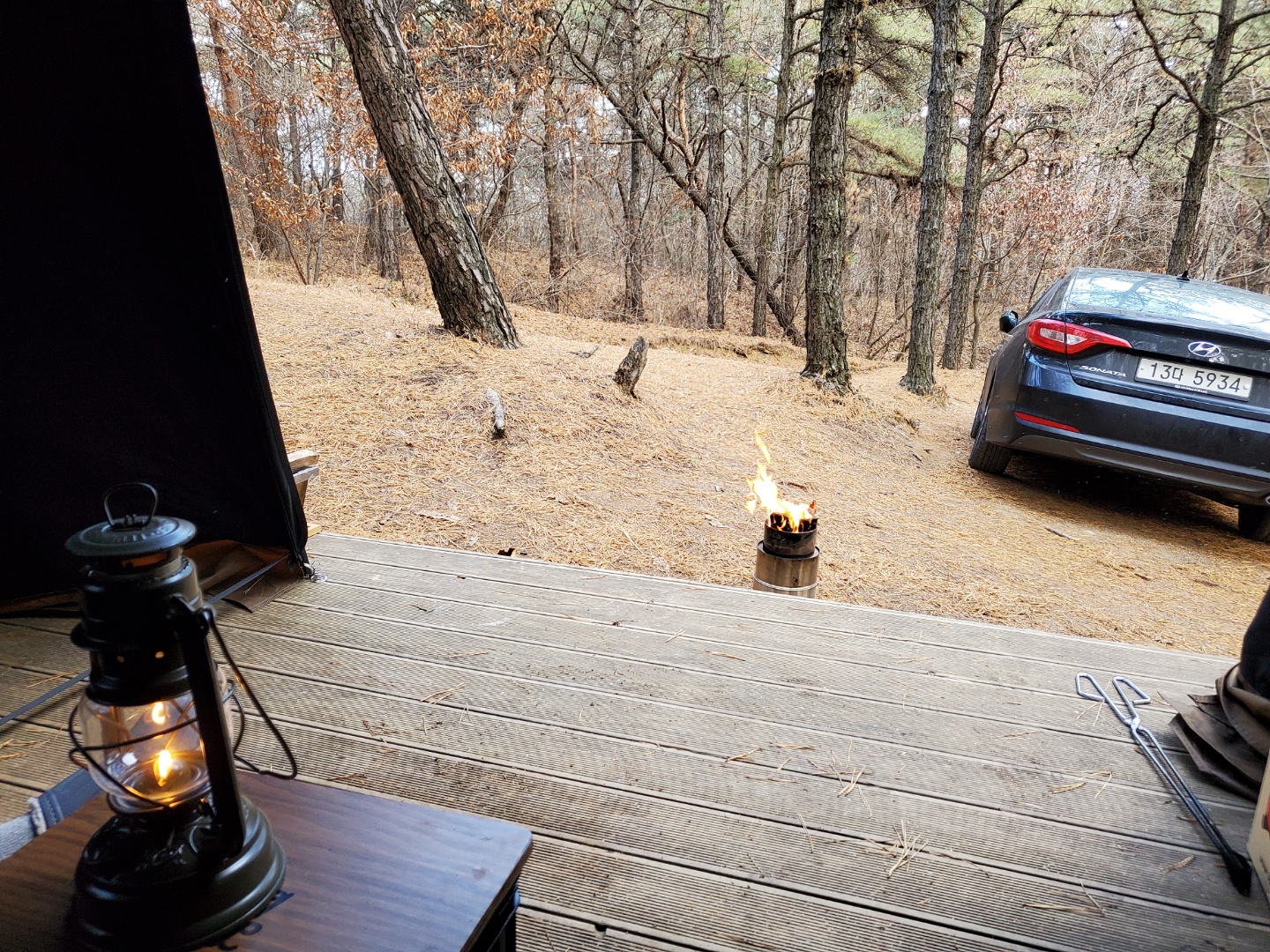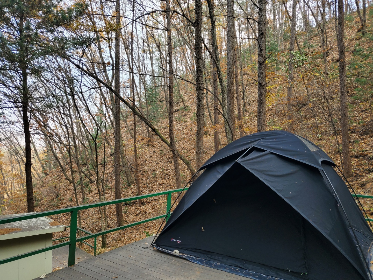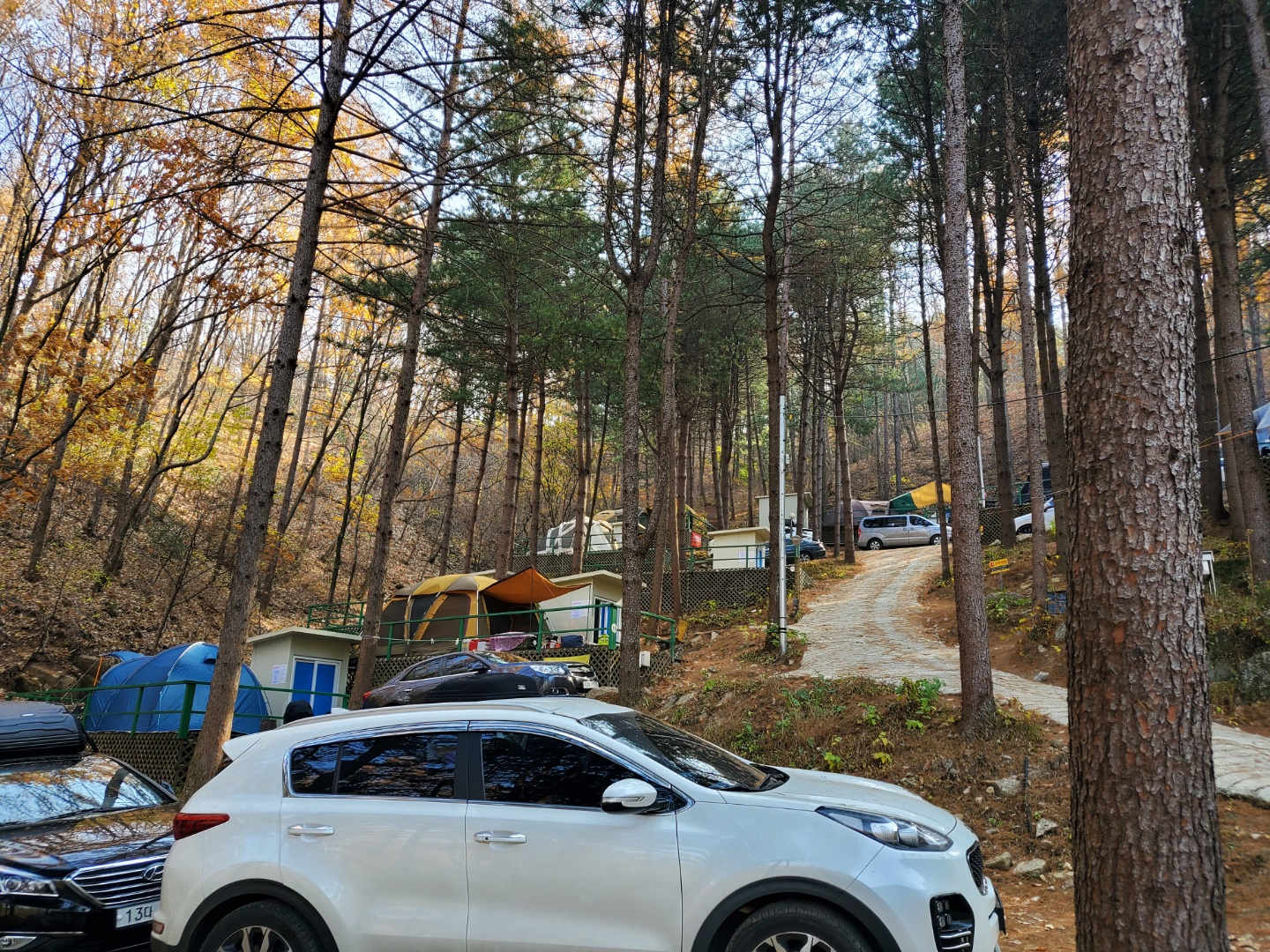 2020년 11월 초에 간 춘천에 위치한 캠핑장이다. 겨울이 더 오기 전에 캠핑을 같은 시기에 시작한 친구네 부부와 함께하기로 한 달 전부터 계획했다. 큰 맘먹고 장만한 난로와 좌식 세팅을 해보고 싶었다. 남편들이 예약하고 계획한 캠핑장이라 아예 확인도 안 하고 자리도 신경도 안 쓰고 따라갔다. 코로나 시기라 개별 화장실이 있다고 친구네 부부는 엄청 좋아했다. 도착해 보니 가파른 산 중턱에 사이트가 하나씩 꽂혀 있는 느낌이랄까 오래된 나무도 우거져 있고 그늘이 많은 곳이라 여름에 이용하면 정말 좋을 거 같다는 생각이 들었다. 늦가을에 갔지만 날씨가 많이 춥지 않아서 편하게 있다가 왔다. 개인적으로는 사이트에 딸린 개별 화장실이 마음에 들지 않았는데 남편과 친구네 부부는 무척 좋아했다. 화장실이 간이 화장실이라 냄새도 조금 나고 벌레도 있어서 나는 그 점이 싫었다. 깨끗한 정식 화장실이 좋다. 사이트는 대부분 큰 편이어서 텐트와 베스티블까지 총 6미터나 되는 우리 텐트도 넉넉히 들어갔다. 사이트마다 단차가 있어서 시야를 가리거나 하는 일은 없다. 하지만 그만큼 경사가 급경사라 초보가 운전하기에 엄청 어렵다는 점 꼭 숙지하고 가야 한다. 그리고 급경사라 매점에 필요한 게 있다면 처음 들어가기 전에 미리 구입하고 가고 매점에 가게 된다면 사장님께 카트를 태워달라고 부탁을 하면 태워주시니 무리하지 말기를 바란다.